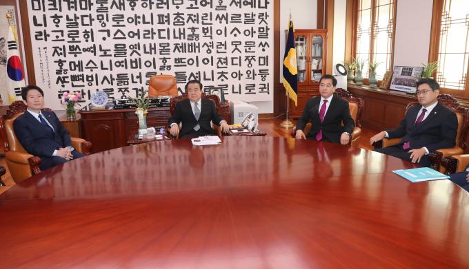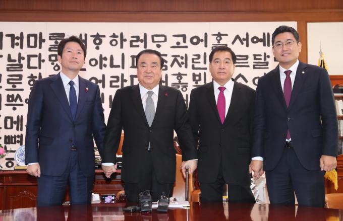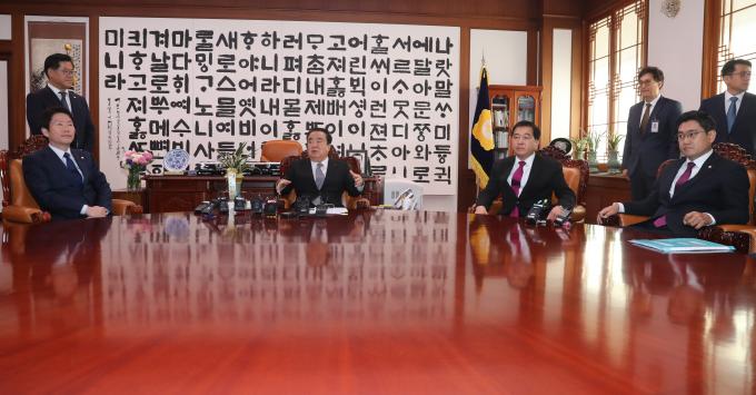 문희상 국회의장이 13일 오전 서울 여의도 국회 의장실에서 여야3당 교섭단체 원내대표와 회동을 하고 있다. 왼쪽부터 더불어민주당 이인영 원내대표, 문 의장, 자유한국당 심재철 원내대표, 바른미래당 오신환 원내대표.
