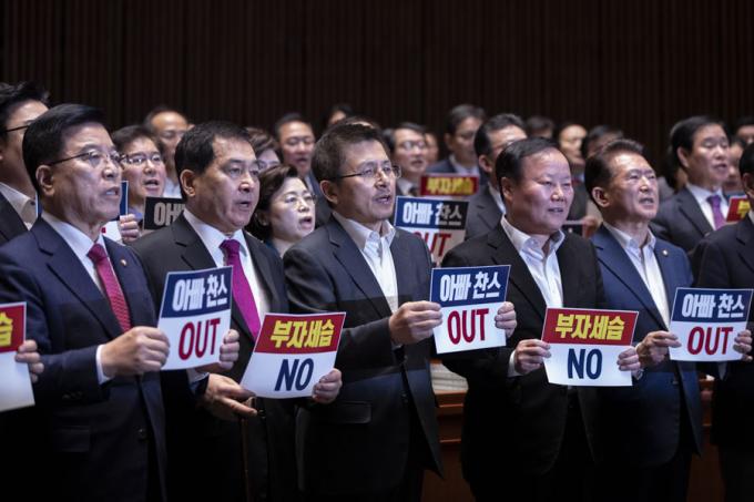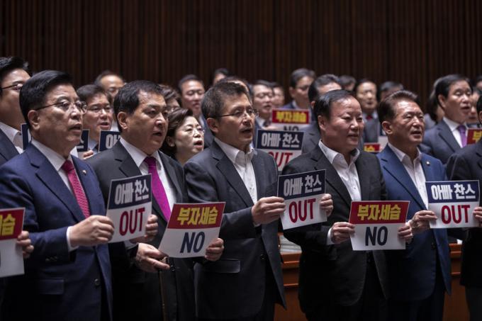 자유한국당 황교안 대표(앞줄 왼쪽 세번째), 심재철 원내대표와 한국당 의원들이 13일 오후 서울 여의도 국회 예결위회의장에서 열린 당 의원총회에 참석해 피켓을 들고 구호를 외치고 있다.