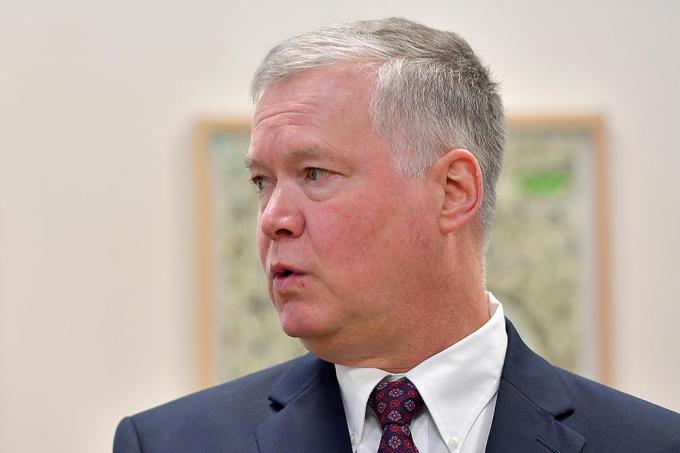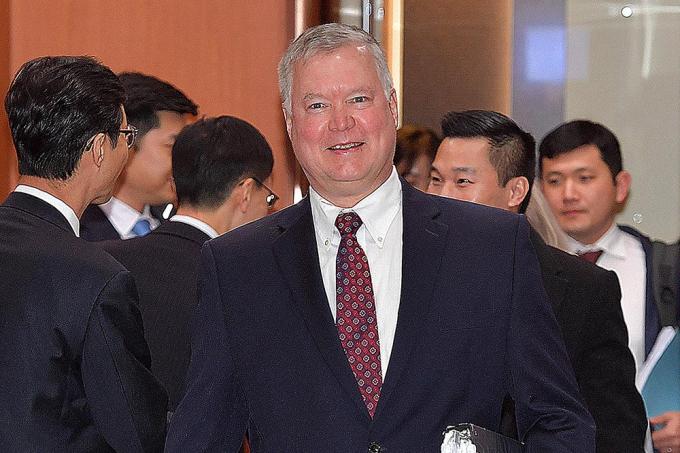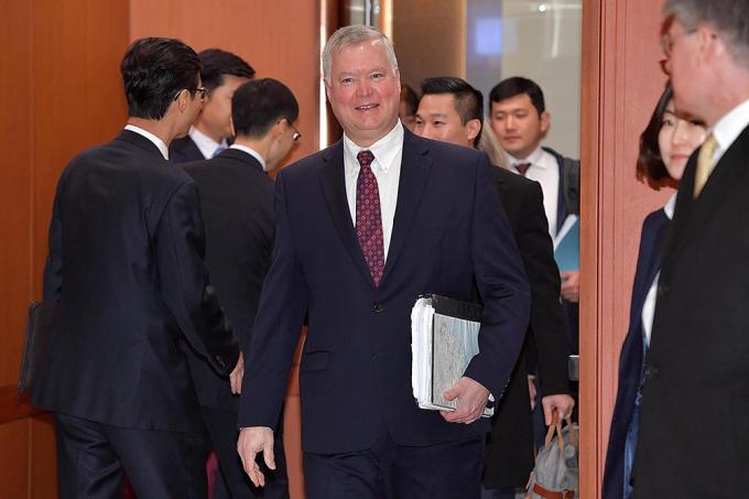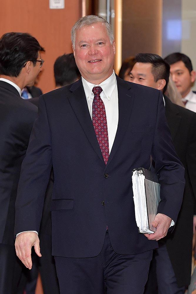 미국 국무부 대북 특별대표인 스티븐 비건 국무부 부장관 지명자가 16일 오전 조세영 외교부 1차관을 만나기 위해 서울 종로구 외교부 청사 접견실로 이동하고 있다.