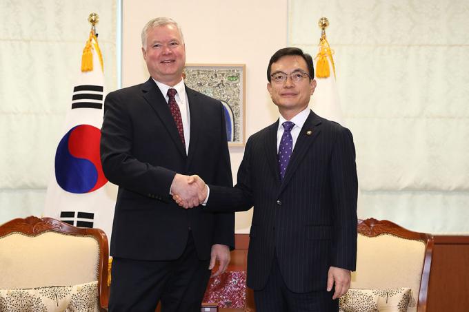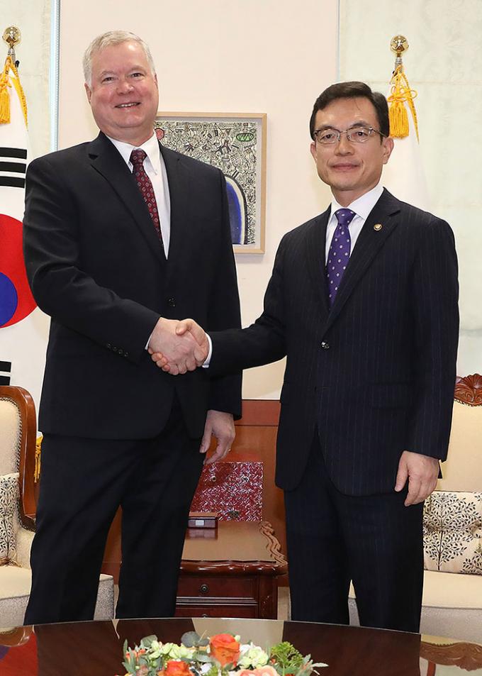 조세영 외교부 1차관과 스티븐 비건 미국 국무부 대북정책특별대표가 16일 오전 서울 종로구 도렴동 외교부 청사에서 만나 악수하고 있다.
