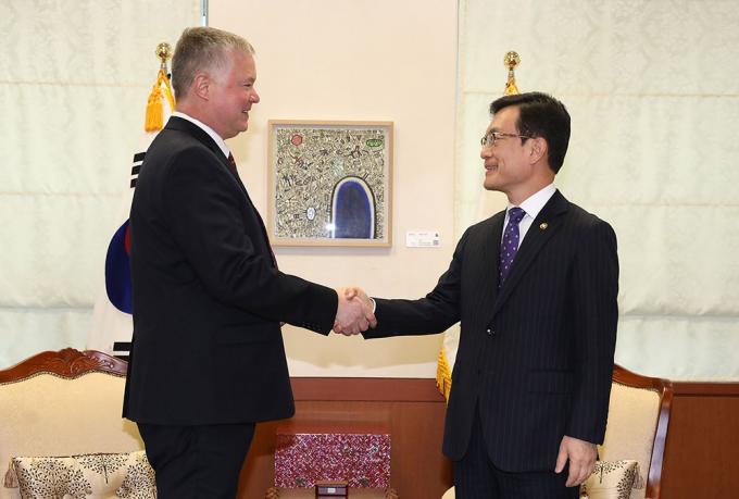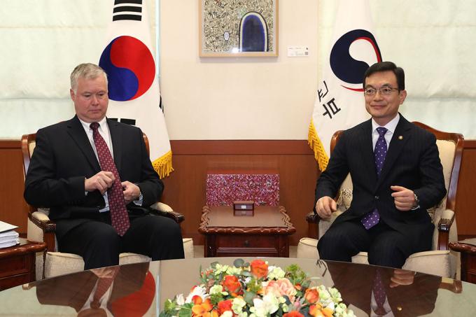 조세영 외교부 1차관과 스티븐 비건 미국 국무부 대북정책특별대표가 16일 오전 서울 종로구 도렴동 외교부 청사에서 만나 악수한 뒤 자리에 앉아 있다.