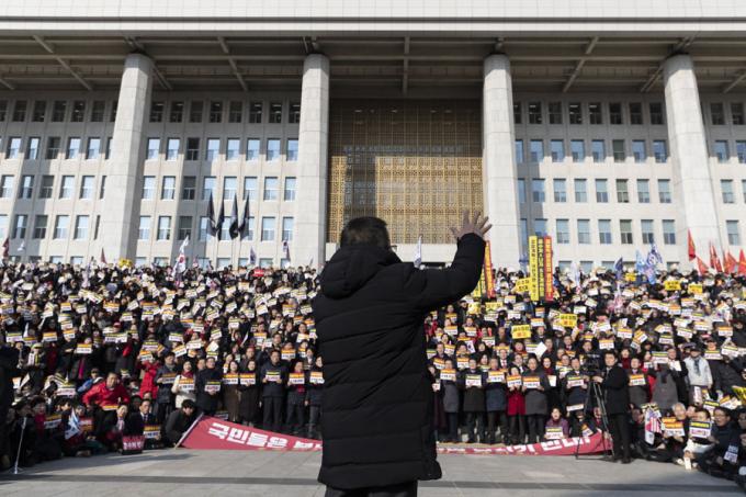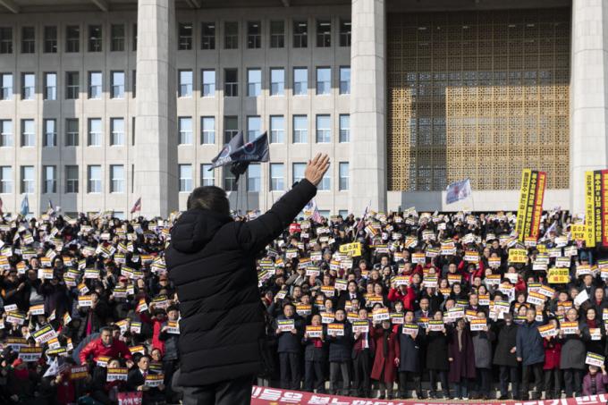 자유한국당 황교안 대표가 16일 오후 서울 여의도 국회 본관 앞에서 열린 '공수처법 선거법 날치기 저지 규탄대회'에 참석해 발언하고 있다.