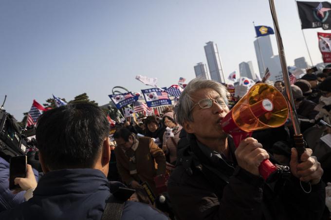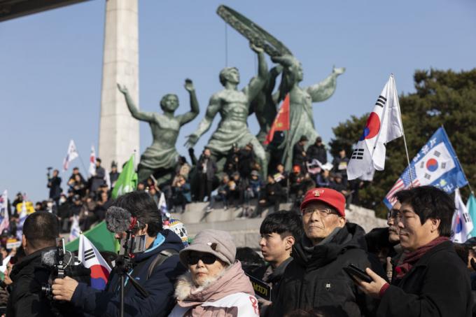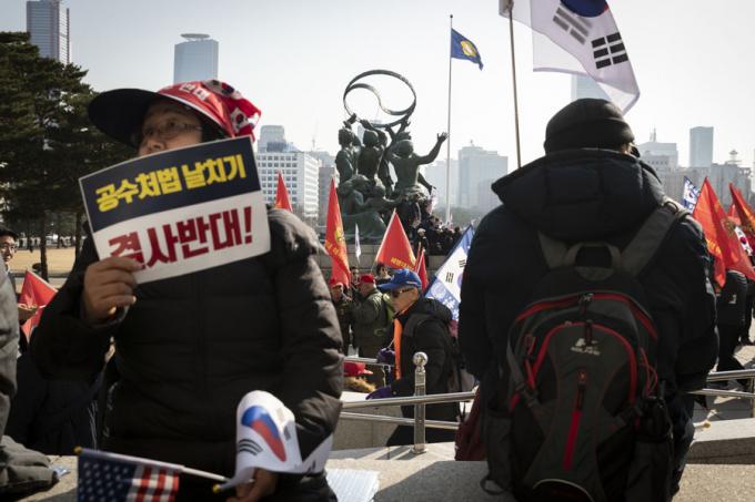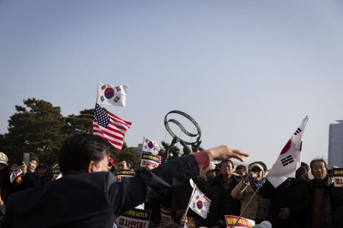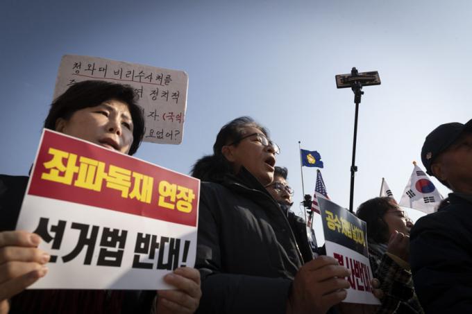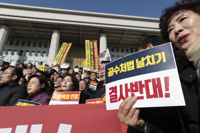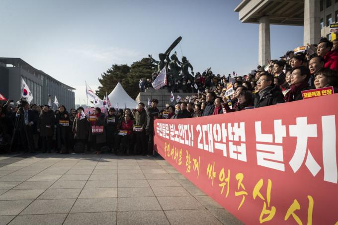 한국당 지도부, 의원들과 보수단체 회원들이 16일 오후 서울 여의도 국회 본관 앞에서 '공수처법 선거법 날치기 저지 규탄대회'를 하고 있다.