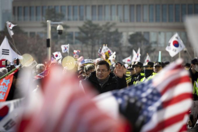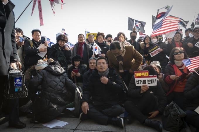 자유한국당 황교안 대표가 16일 오후 서울 여의도 국회 본관 앞에서 열린 '공수처법 선거법 날치기 저지 규탄대회'에서 보수단체 회원들과 인사를 하고 있다.