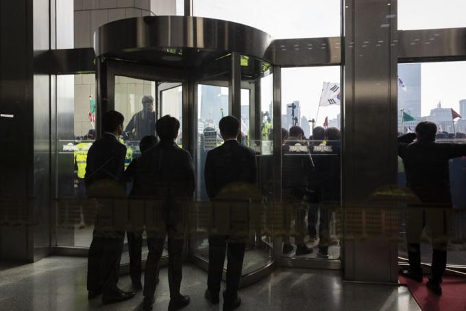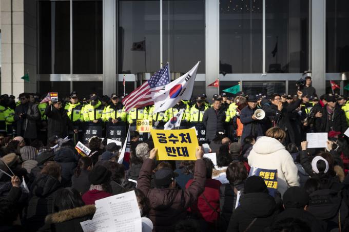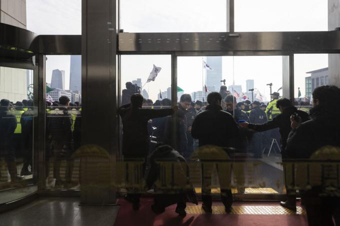 보수단체 회원들이 16일 오후 서울 여의도 국회 본관 앞에서 '공수처법 선거법 날치기 저지 규탄대회' 중 국회 본관 강제 진입을 시도하자 경찰이 막아서고 있다.