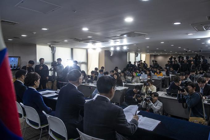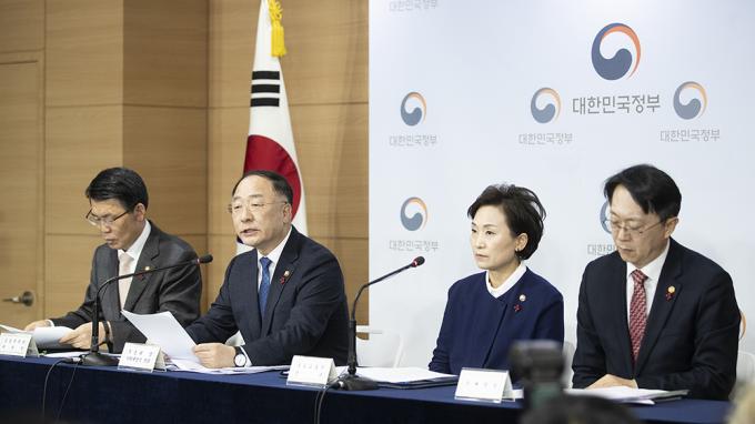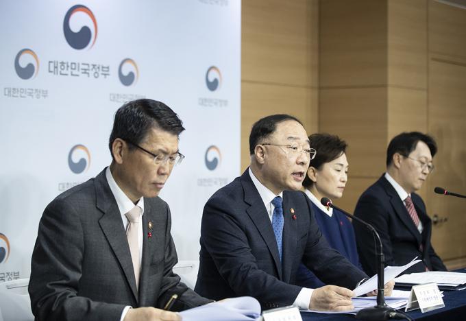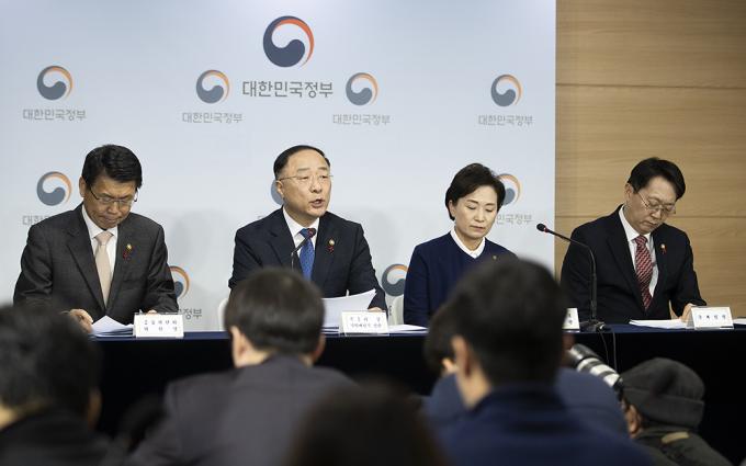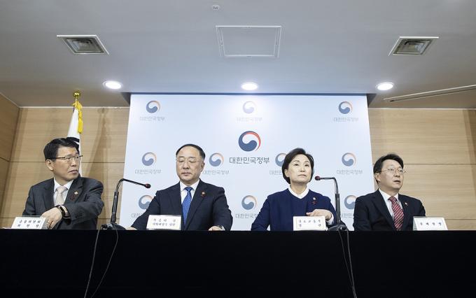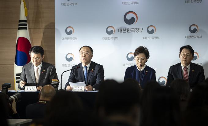 홍남기 경제부총리 겸 기획재정부 장관이 16일 오후 서울 종로구 정부서울청사에서 주택시장 안정화 방안 관계부처 합동 브리핑을 하고 있다. 왼쪽부터 은성수 금융위원장, 홍남기 경제부총리 겸 기획재정부 장관, 김현미 국토교통부 장관, 김현준 국세청장.
