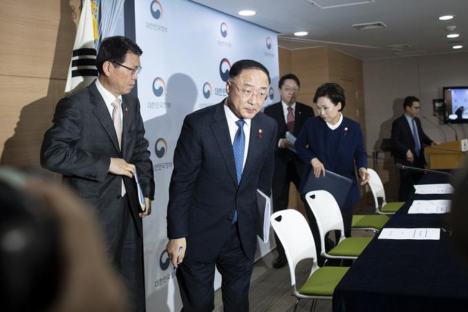 홍남기 경제부총리 겸 기획재정부 장관이 16일 오후 서울 종로구 정부서울청사에서 주택시장 안정화 방안 관계부처 합동 브리핑을 마친 뒤 나가고 있다.