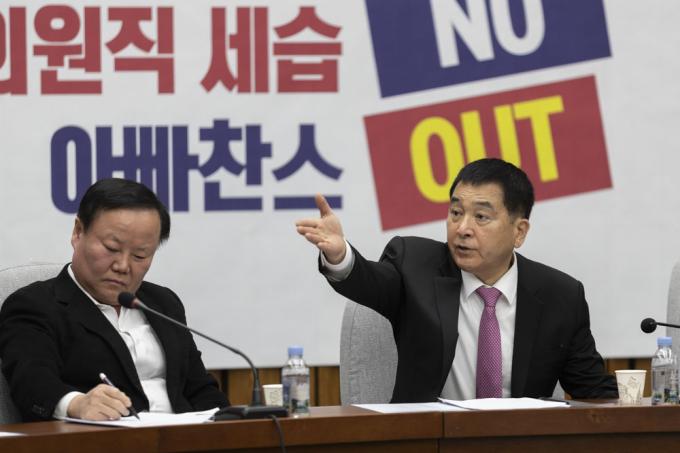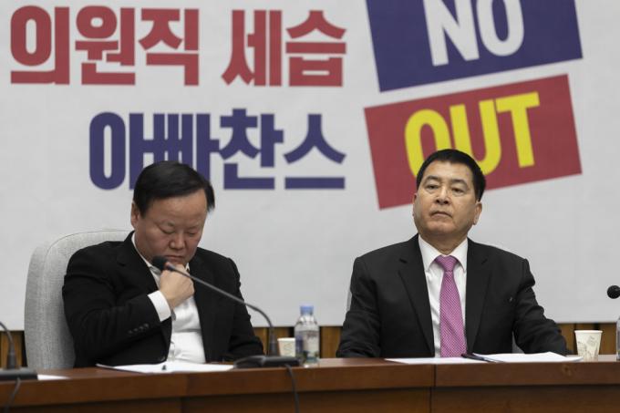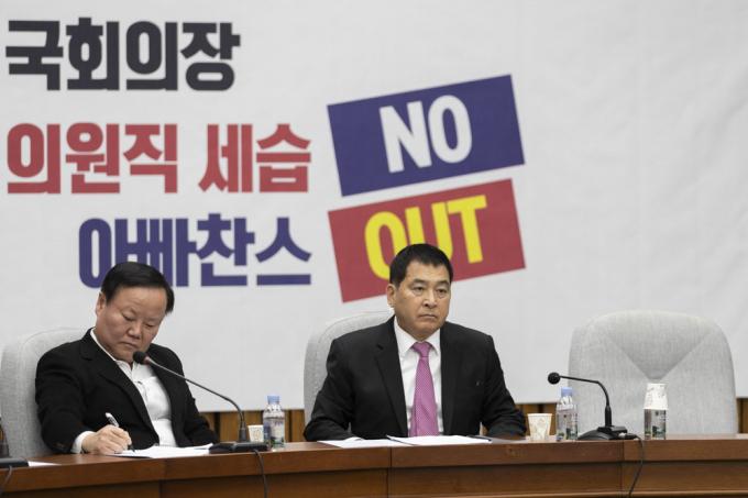 자유한국당 심재철 원내대표(오른쪽)가 김재원 정책위의장과 17일 오전 서울 여의도 국회 제3회의장에서 열린 당 원내대책회의에 참석해 발언하고 있다.