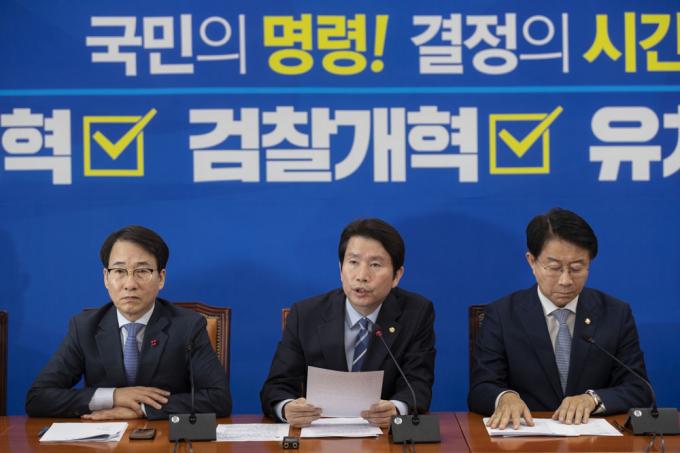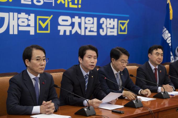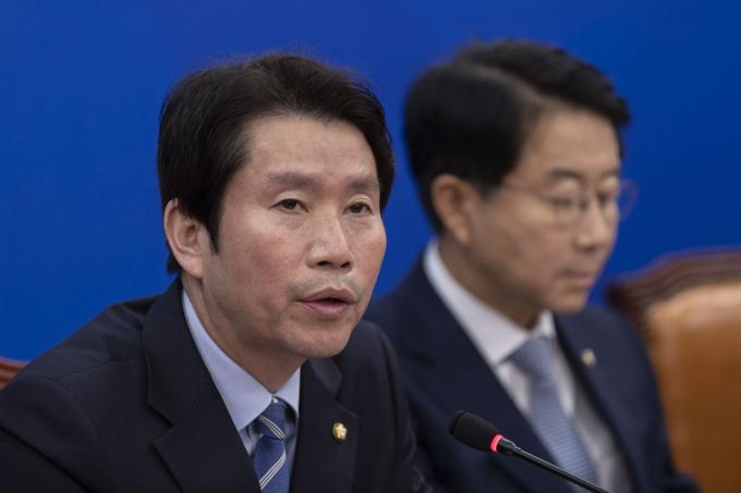 더불어민주당 이인영 원내대표(가운데)가 17일 오전 서울 여의도 국회 당 원내대표 회의실에서 열린 원내대표단-상임위간사단 연석회의에 참석해 발언하고 있다.