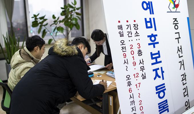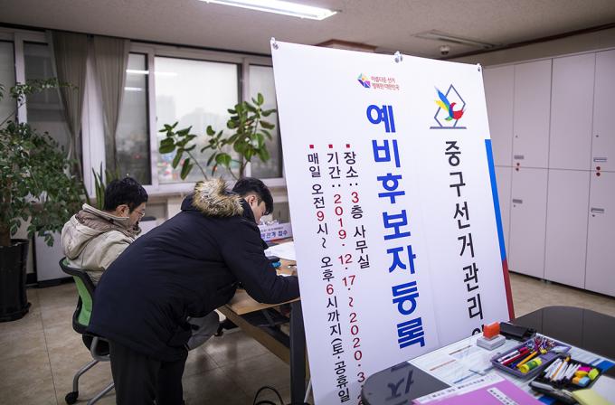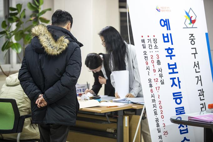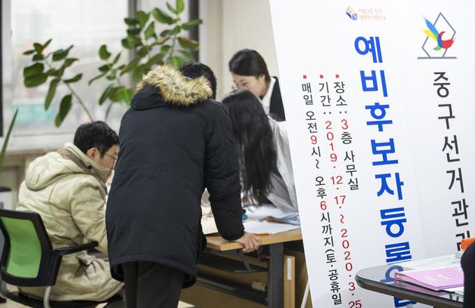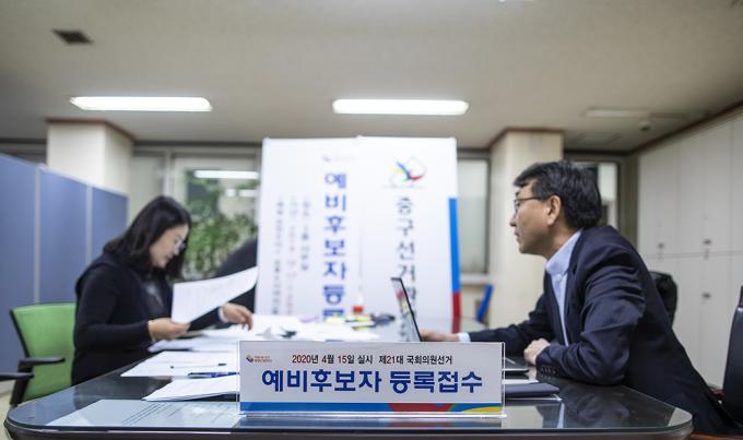 제21대 국회의원선거 예비후보 등록이 시작된 17일 오전 서울 중구 선거관리위원회에서 예비후보들이 등록을 하고 있다.