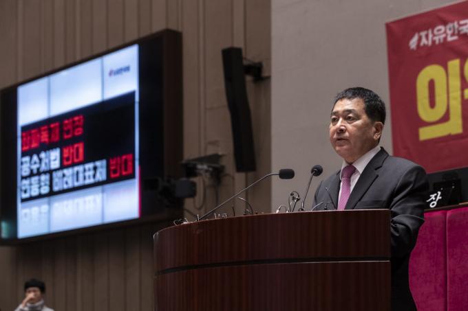 자유한국당 심재철 원내대표가 17일 오후 서울 여의도 국회 예결위회의장에서 열린 당 의원총회에 참석해 발언하고 있다.