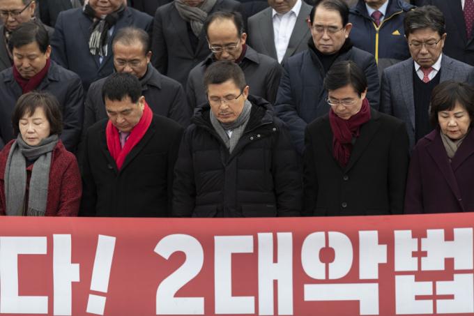 자유한국당 황교안 대표(앞줄 왼쪽 세번째), 심재철 원내대표(앞줄 왼쪽 두번째)가 17일 오후 서울 여의도 국회 본관 앞에서 열린 '공수처법 선거법 날치기 저지 규탄대회'에 참석해 묵념하고 있다.