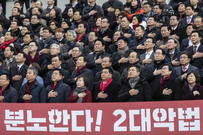 자유한국당 황교안 대표(앞줄 왼쪽 여섯번째), 심재철 원내대표(앞줄 왼쪽 다섯번째)가 17일 오후 서울 여의도 국회 본관 앞에서 열린 '공수처법 선거법 날치기 저지 규탄대회'에 참석해 국민의례를 하고 있다.