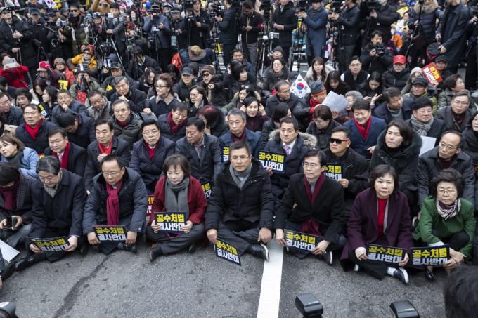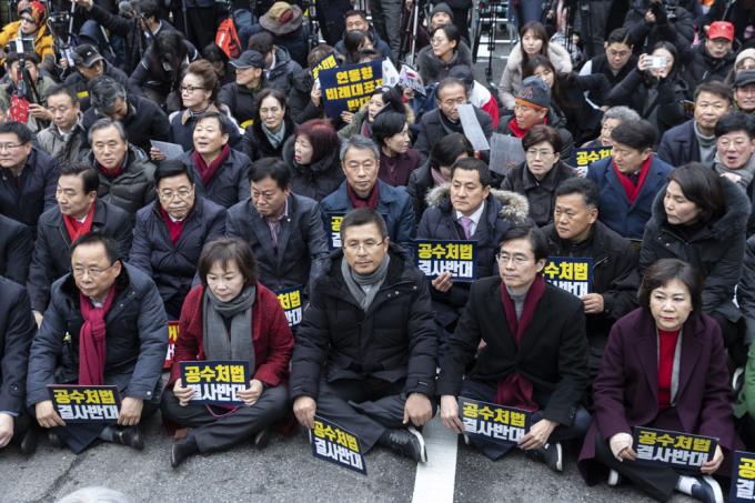 자유한국당 황교안 대표(앞줄 왼쪽 세번째), 당 의원들과 보수단체 회원들이 17일 오후 서울 여의도 국회의사당 앞에서 '공수처법 선거법 날치기 저지 규탄대회'를 하고 있다.