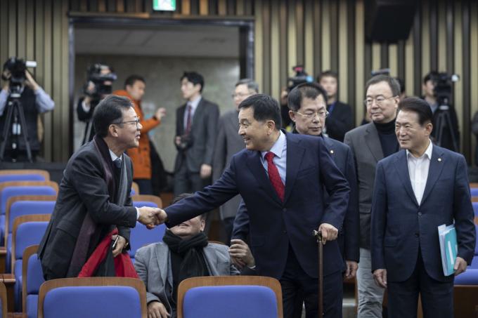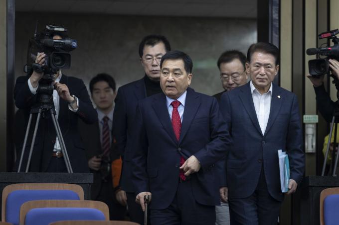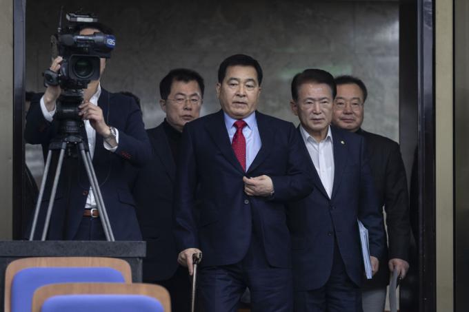 자유한국당 심재철 원내대표가 18일 오후 서울 여의도 국회 제4회의장에서 열린 당 의원총회에 참석하고 있다.