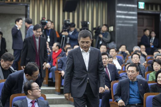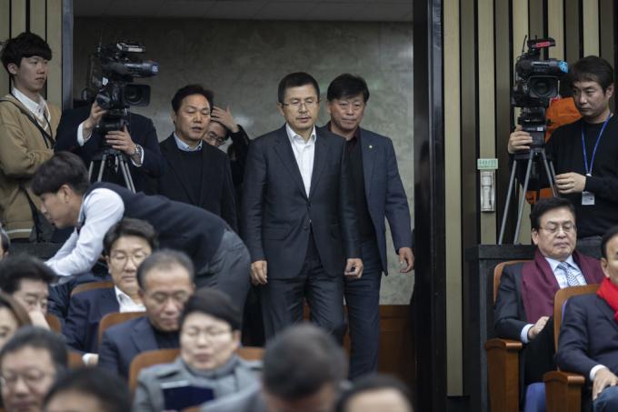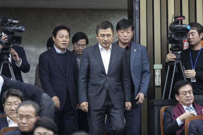 자유한국당 황교안 대표(가운데)가 18일 오후 서울 여의도 국회 제4회의장에서 열린 당 의원총회에 참석하고 있다.