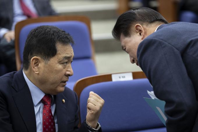 자유한국당 심재철 원내대표(왼쪽)와 원내수석 부대표인 김한표 의원이 18일 오후 서울 여의도 국회 제4회의장에서 열린 당 의원총회에 참석해 대화하고 있다.