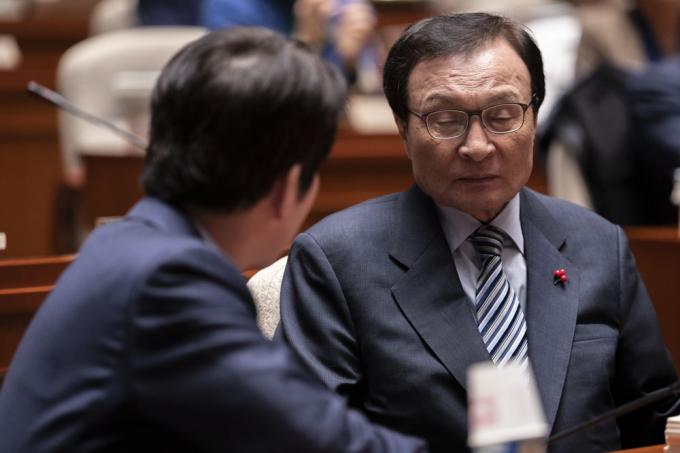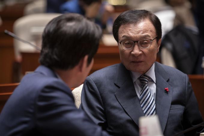 더불어민주당 이해찬 대표(오른쪽)와 이인영 원내대표가 18일 오후 서울 여의도 국회 예결위회의장에서 열린 당 의원총회에 참석해 대화하고 있다.