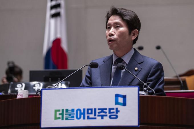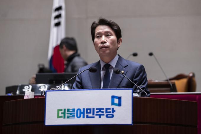 더불어민주당 이인영 원내대표가 18일 오후 서울 여의도 국회 예결위회의장에서 열린 당 의원총회에 참석해 발언하고 있다.