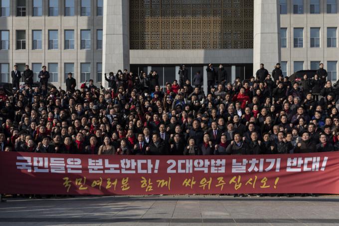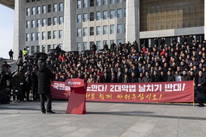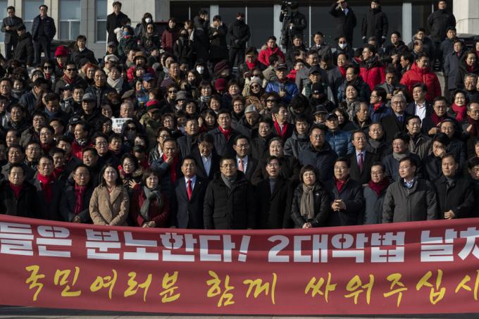 자유한국당 황교안 대표(앞줄 왼쪽 일곱번째), 심재철 원내대표(앞줄 왼쪽 여섯번째), 당 의원들과 관계자들이 18일 오후 서울 여의도 국회 본관 앞 계단에서 '공수처법 선거법 날치기 저지 규탄대회'를 하고 있다.