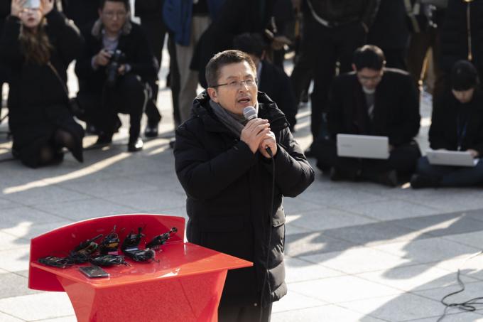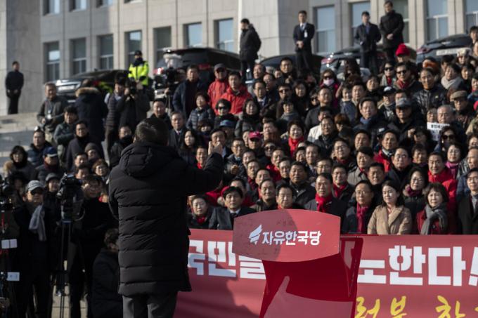 자유한국당 황교안 대표가 18일 오후 서울 여의도 국회 본관 앞 계단에서 열린 '공수처법 선거법 날치기 저지 규탄대회'에 참석해 발언하고 있다.