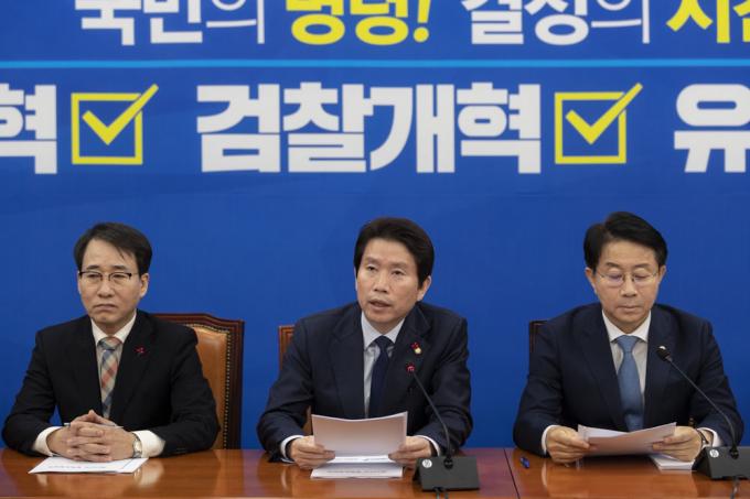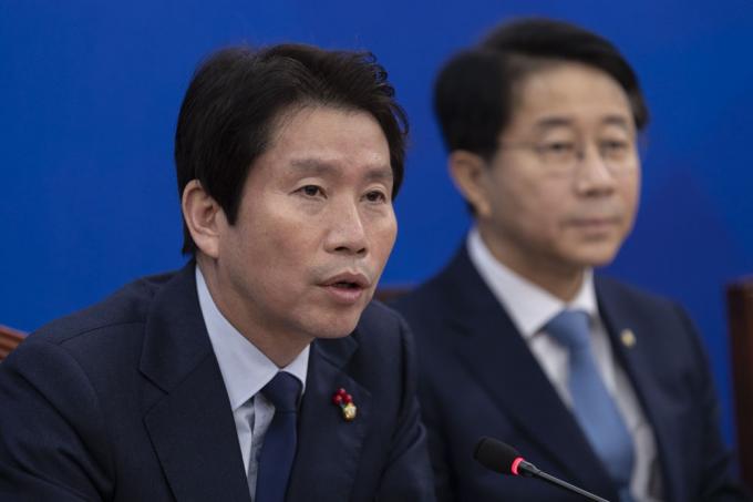 더불어민주당 이인영 원내대표(왼쪽)가 19일 오전 서울 여의도 국회 원내대표회의실에서 열린 정책조정회의에 참석해 발언하고 있다.
