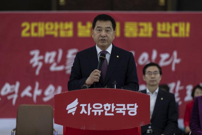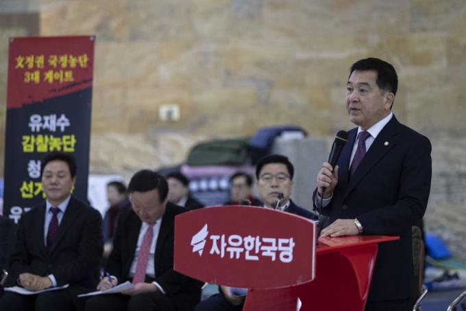 자유한국당 심재철 원내대표가 19일 오전 서울 여의도 국회 로텐더홀에서 열린 당 최고위원회의에 참석해 발언하고 있다.