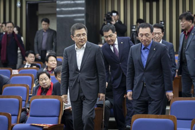 자유한국당 황교안 대표, 심재철 원내대표가 19일 오후 서울 여의도 국회 제4회의장에서 열린 당 의원총회에 참석하고 있다.KPI뉴스 / 문재원 기자 mjw@kpinews.kr