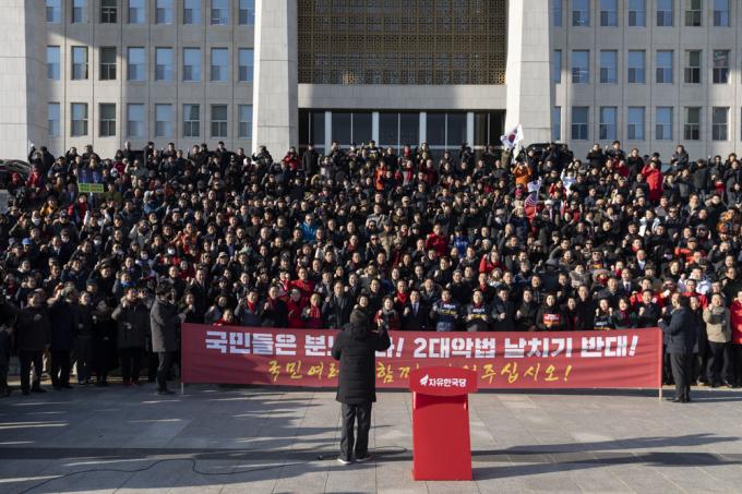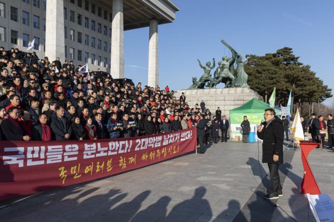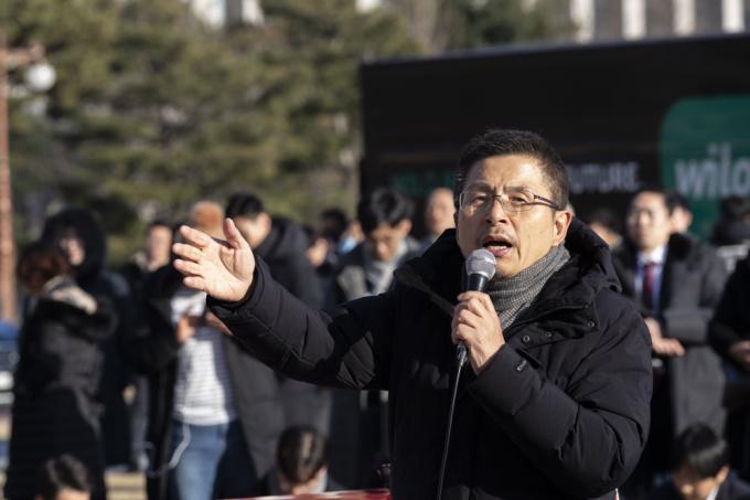 자유한국당 황교안 대표가 19일 오후 서울 여의도 국회 본관 앞에서 열린 '공수처법 선거법 날치기 저지 규탄대회'에 참석해 발언하고 있다.