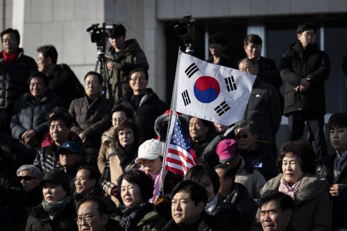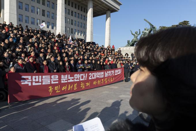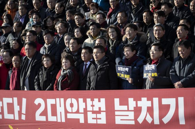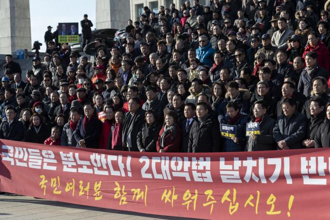 자유한국당 황교안 대표(앞줄 왼쪽 일곱번째), 심재철 원내대표(여섯번째), 당 의원들과 보수단체 회원들이 19일 오후 서울 여의도 국회 본관 앞에서 '공수처법 선거법 날치기 저지 규탄대회'를 하고 있다.