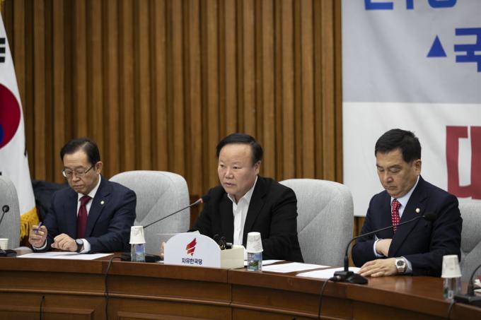 자유한국당 김재원 정책위의장(가운데)이 20일 오전 서울 여의도 국회 제3회의장에서 열린 당 원내대책회의에 참석해 발언하고 있다.