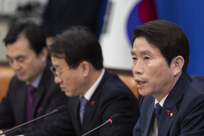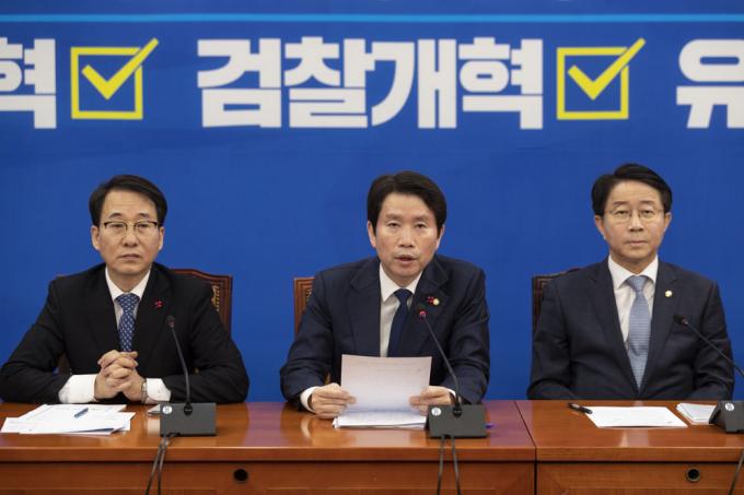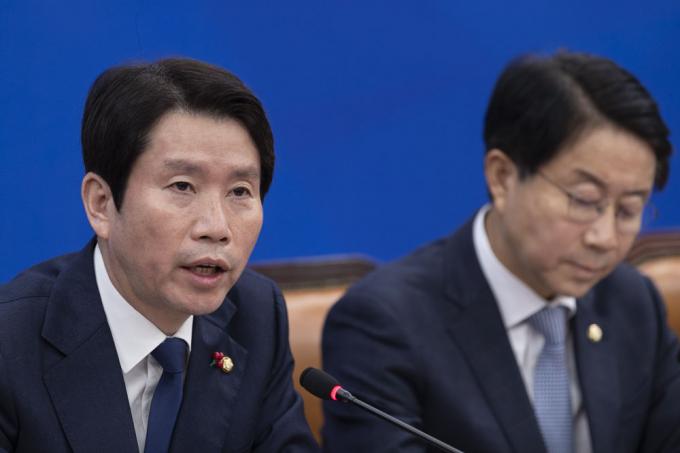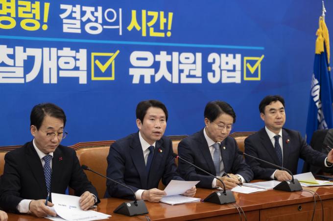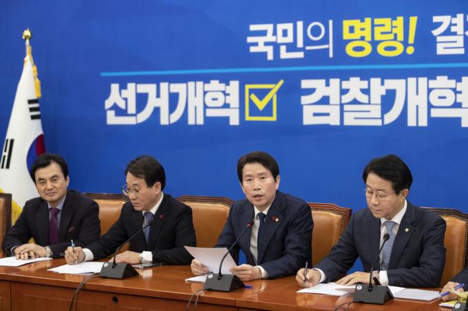 더불어민주당 이인영 원내대표(왼쪽 세번째)가 24일 오전 서울 여의도 국회 원내대표회의실에서 열린 원내대책회의-상임위간사단 연석회의에 참석해 발언하고 있다.