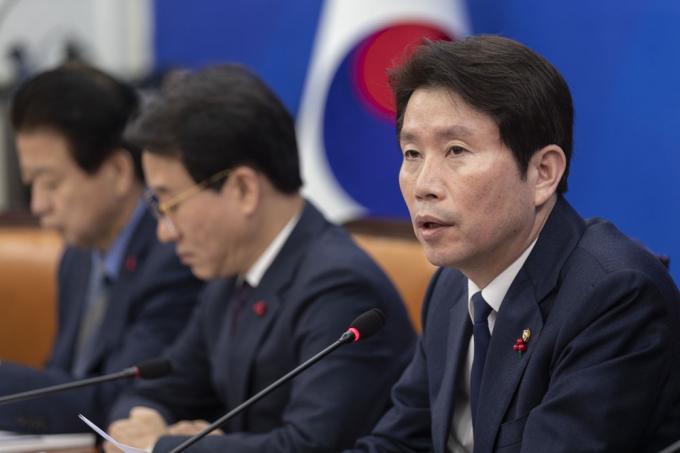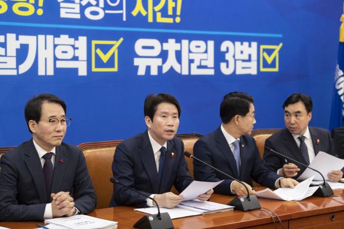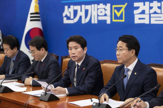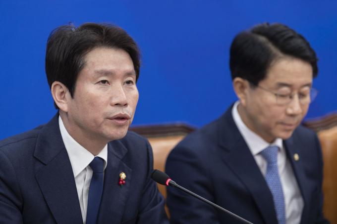 더불어민주당 이인영 원내대표(왼쪽 두번째)가 26일 오전 서울 여의도 국회 원내대표회의실에서 열린 정책조정회의에 참석해 발언하고 있다.