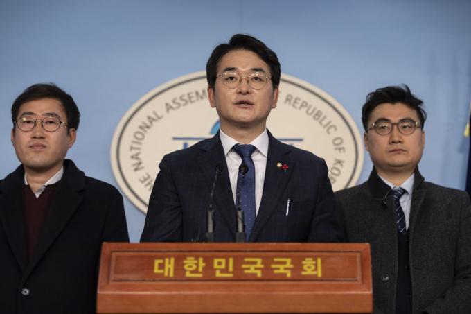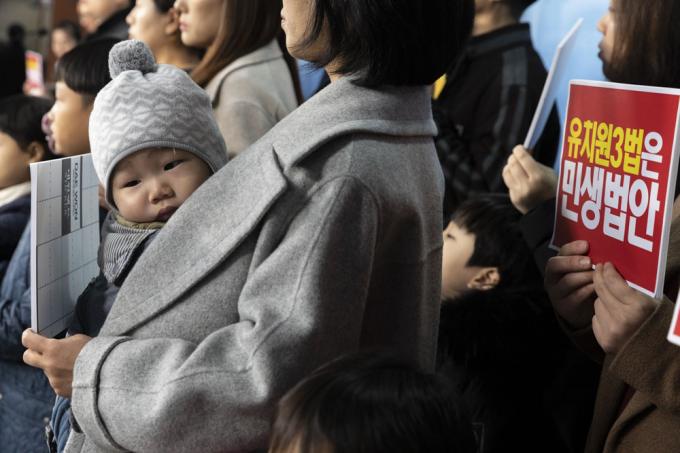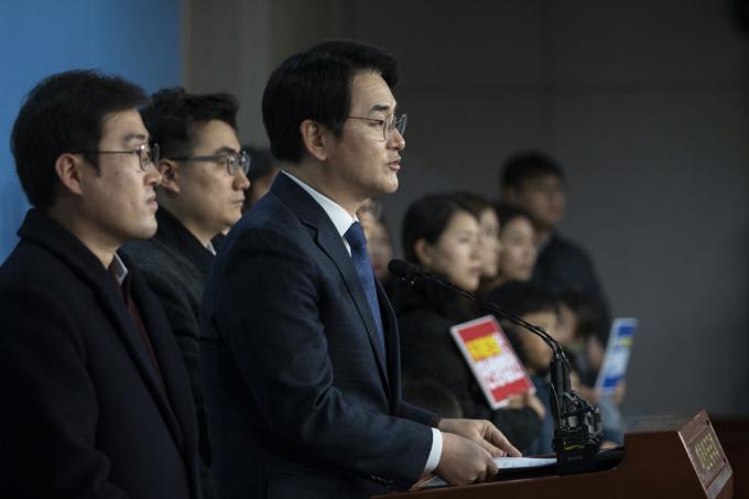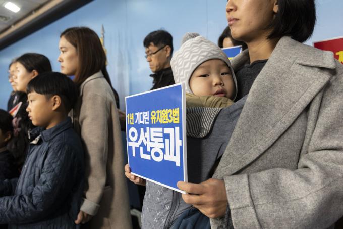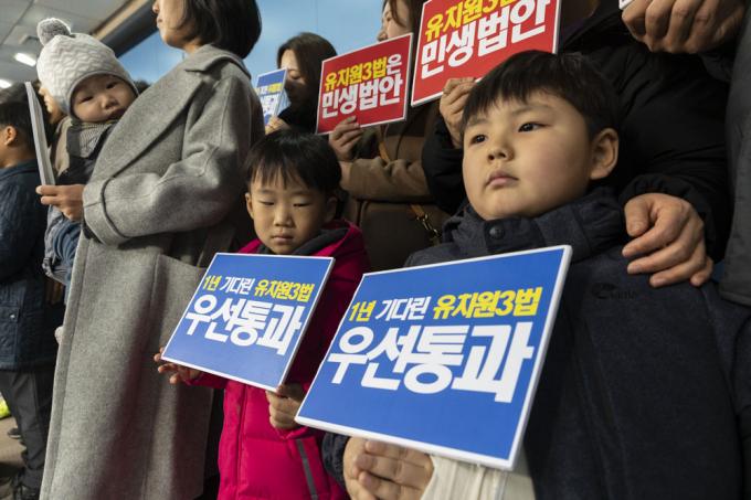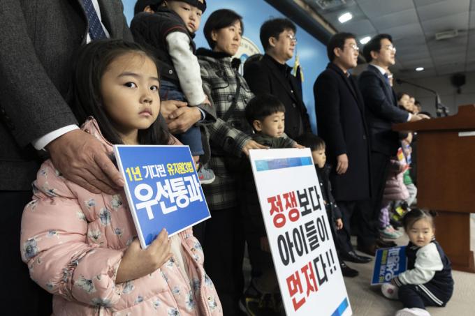 더불어민주당 박용진 의원, 경기 동탄지역 학부모들과 아이들이 26일 오전 서울 여의도 국회 정론관에서 '유치원 3법 패스트트랙 1년, 국회 통과 촉구' 기자회견을 하고 있다.