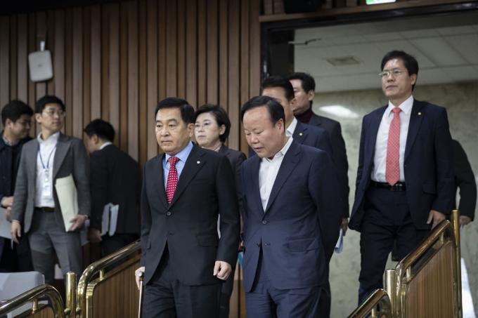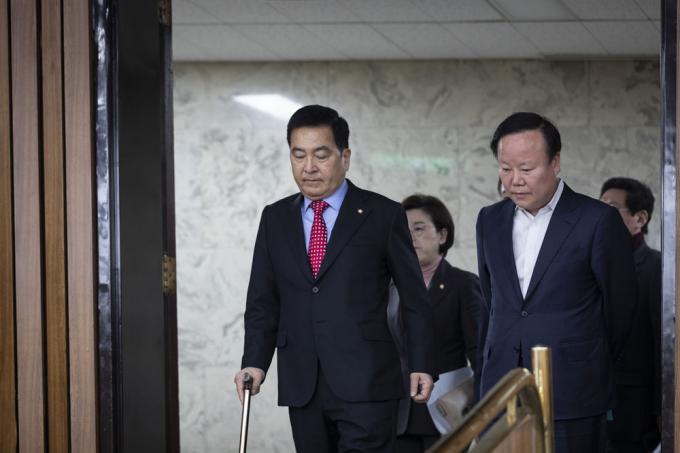 자유한국당 심재철 원내대표(왼쪽)와 김재원 정책위의장이 27일 오전 서울 여의도 국회 제3회의장에서 열린 당 원내대책회의에 입장하고 있다.