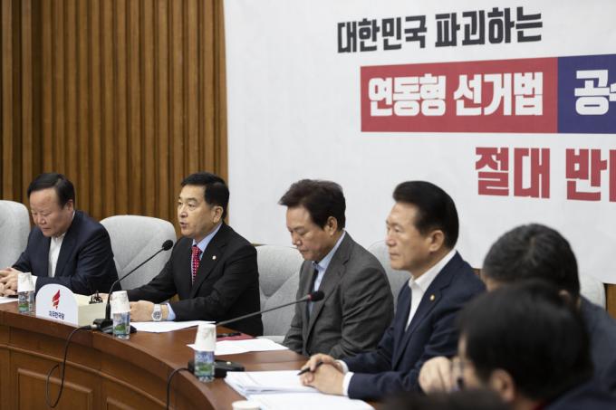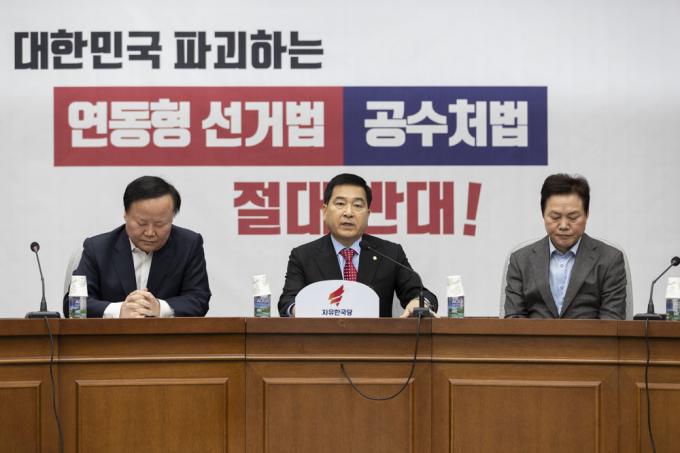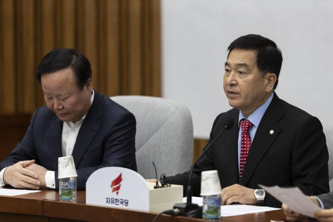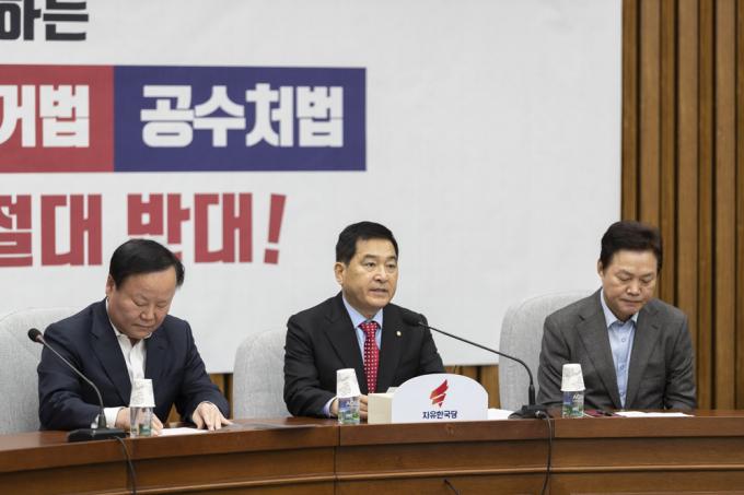 자유한국당 심재철 원내대표(왼쪽 두번째)가 27일 오전 서울 여의도 국회 제3회의장에서 열린 당 원내대책회의에 참석해 발언하고 있다.