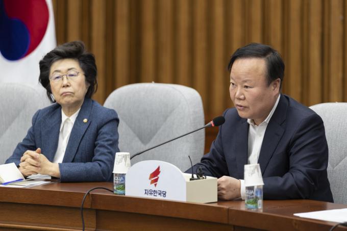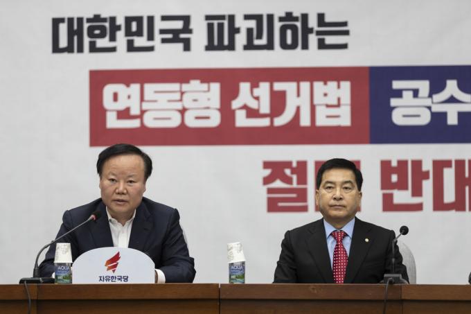 자유한국당 김재원 정책위의장(오른쪽)이 27일 오전 서울 여의도 국회 제3회의장에서 열린 당 원내대책회의에 참석해 발언하고 있다.