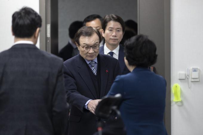 더불어민주당 이해찬 대표와 이인영 원내대표가 27일 오전 서울 여의도 국회 의원회관에서 열린 당 확대간부회의에 참석하고 있다.