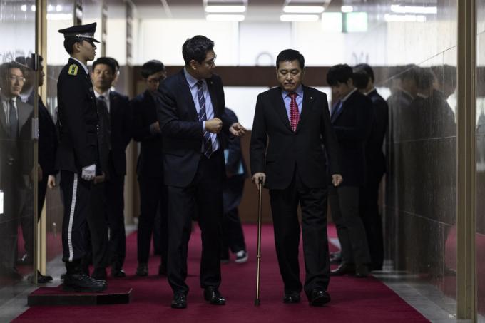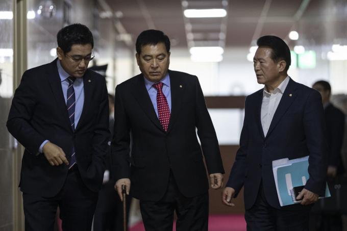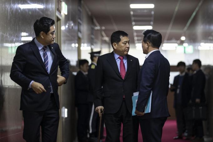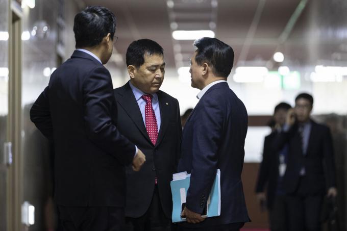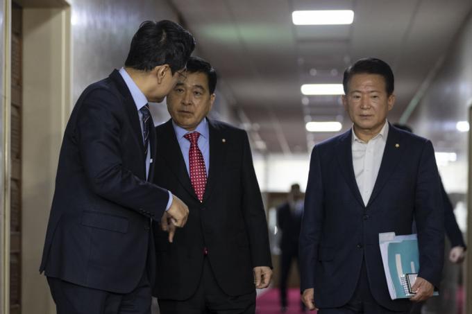 자유한국당 심재철 원내대표(가운데)와 바른미래당 오신환 원내대표가 27일 오전 서울 여의도 국회에서 열린 국회의장-3당 원내대표 회동을 마치고 대화하며 이동하고 있다. 오른쪽은 자유한국당 김한표 원내수석부대표.