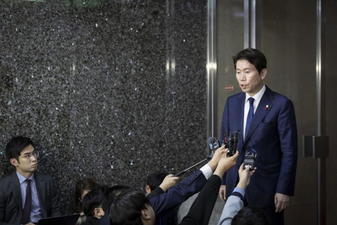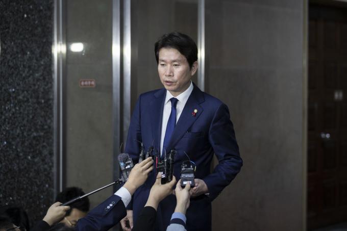 더불어민주당 이인영 원내대표가 27일 오전 서울 여의도 국회에서 열린 국회의장-3당 원내대표 회동을 마치고 취재진 질문에 답하고 있다.