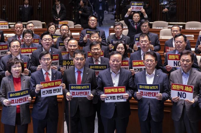 자유한국당 심재철 원내대표(앞줄 왼쪽 세번째)와 당 의원들이 27일 오후 서울 여의도 국회 예결위회의장에서 열린 의원총회에 참석해 선거법, 공수처법 규탄 피켓을 들고 구호를 외치고 있다. 이날 의원총회는 구호 제창 직후 비공개로 전환됐다.
