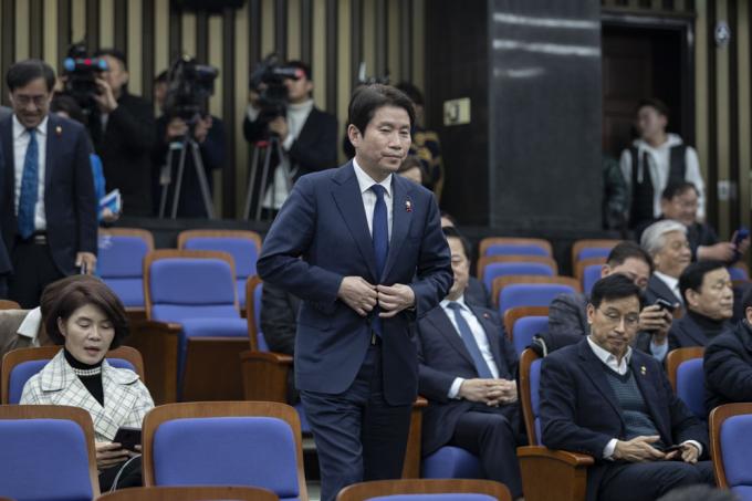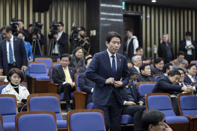 더불어민주당 이인영 원내대표가 27일 오후 서울 여의도 국회 제4회의장에서 열린 당 의원총회에 참석하고 있다.