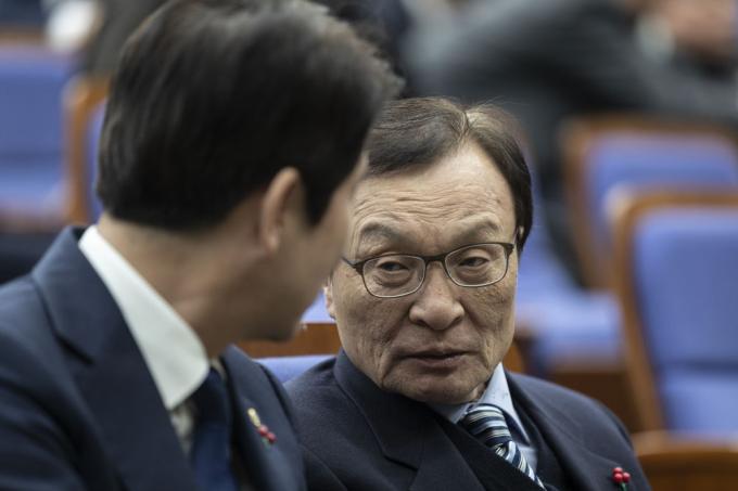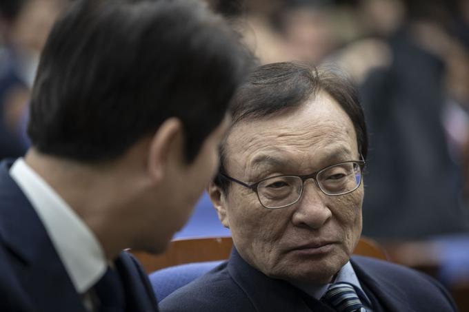 더불어민주당 이해찬 대표(오른쪽)와 이인영 원내대표가 27일 오후 서울 여의도 국회 제4회의장에서 열린 당 의원총회에 참석해 대화하고 있다.