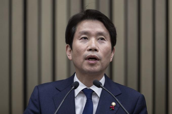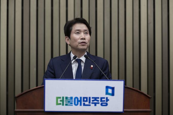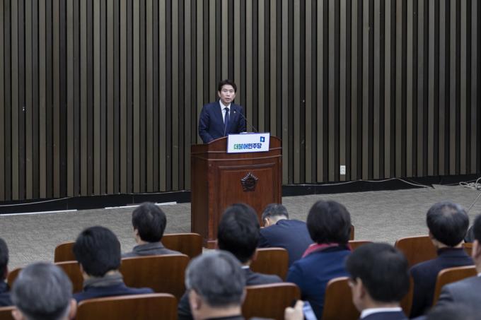 더불어민주당 이인영 원내대표가 27일 오후 서울 여의도 국회 제4회의장에서 열린 당 의원총회에서 발언하고 있다.