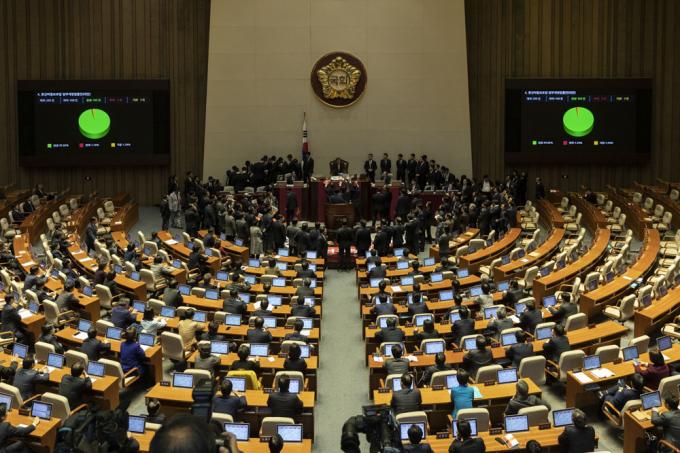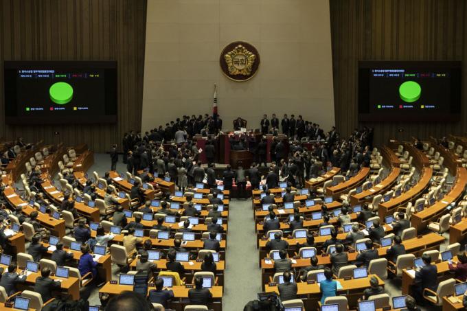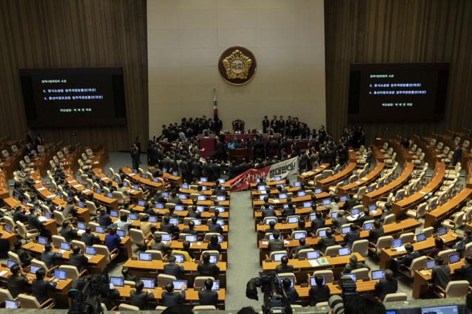 문희상 국회의장이 27일 오후 서울 여의도 국회 본회의장에서 자유한국당 의원들의 항의를 받으며 '법제사법위원회 소관 형사소송법 일부개정법률안, 통신비밀보호법 일부개정법률안'을 가결하고 있다.