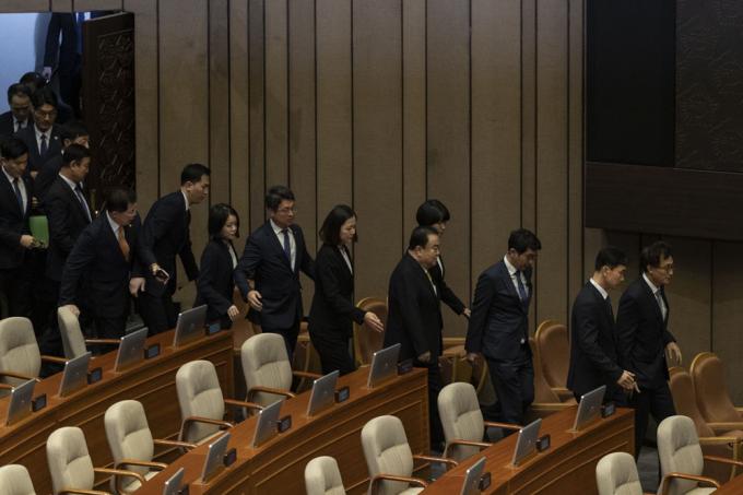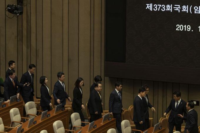 문희상 국회의장이 27일 오후 서울 여의도 국회 본회의장에서 국회 경위들의 경호를 받으며 의장석으로 향하고 있다.