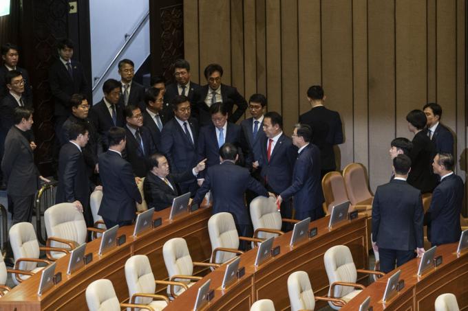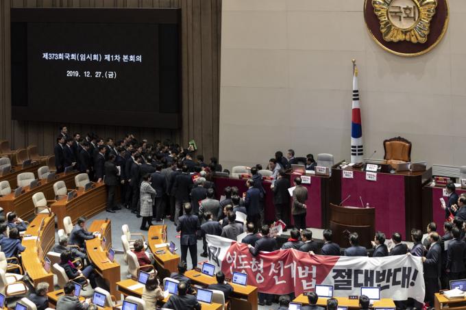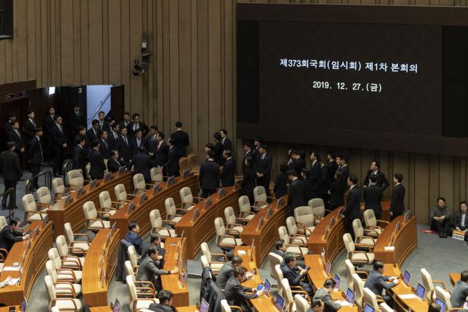 문희상 국회의장이 27일 오후 서울 여의도 국회 본회의장에서 자유한국당 의원들의 반발로 의장석에 오르지 못하자 돌아서고 있다.