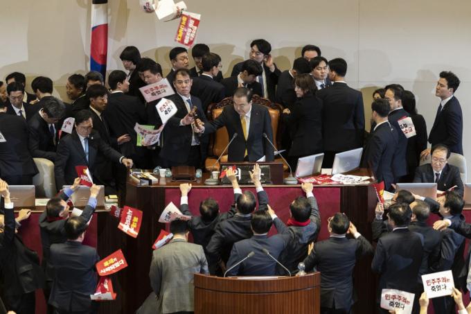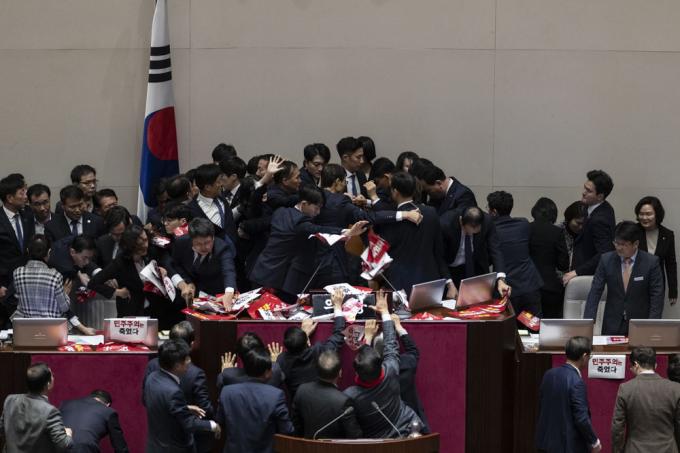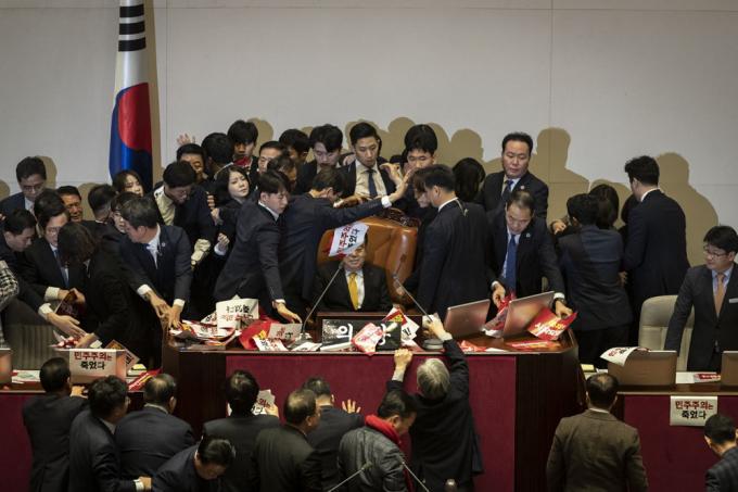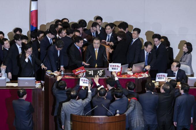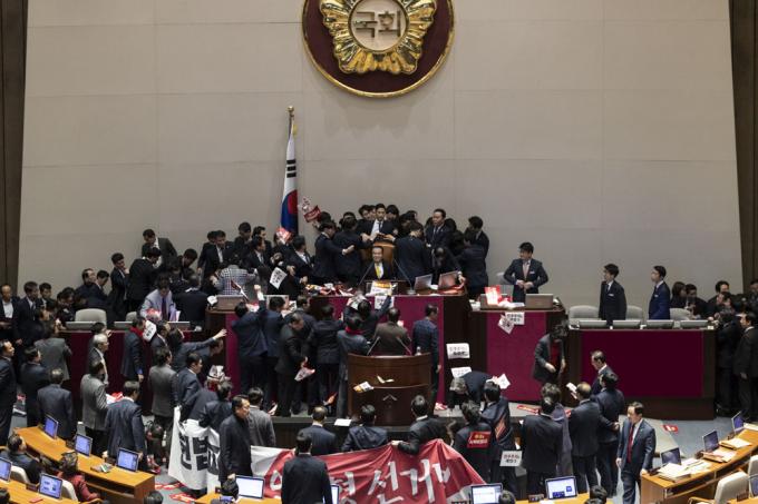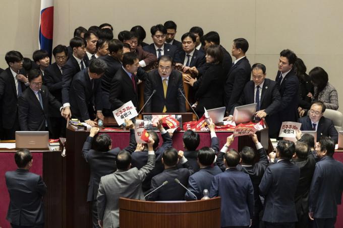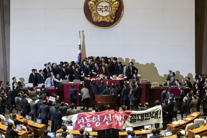 문희상 국회의장이 27일 오후 서울 여의도 국회 본회의장에서 자유한국당 의원들의 항의를 받으며 '공직선거법 개정안'을 가결하고 있다.
