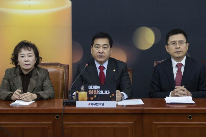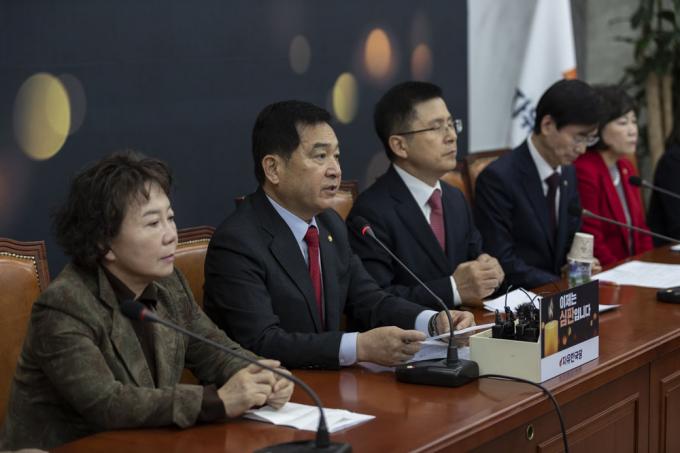 자유한국당 심재철 원내대표(가운데)가 30일 오전 서울 여의도 국회에서 열린 한국당 최고위원회의에 참석해 발언하고 있다.