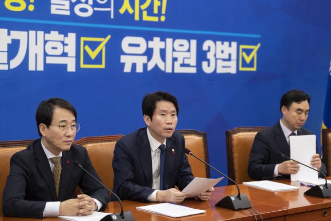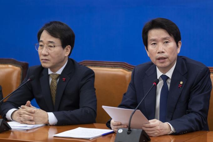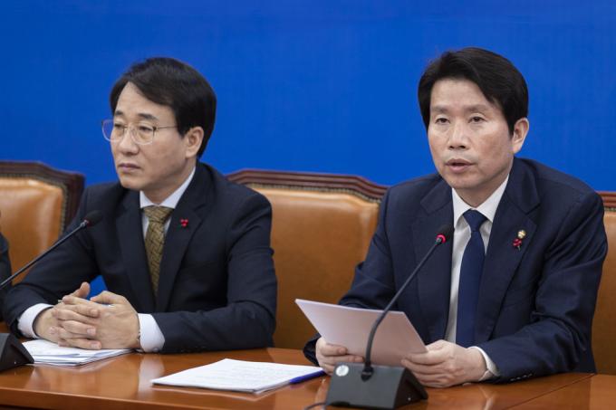 더불어민주당 이인영 원내대표(오른쪽)가 7일 오전 서울 여의도 국회에서 열린 당 원내대책회의에 참석해 발언하고 있다.